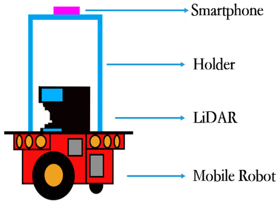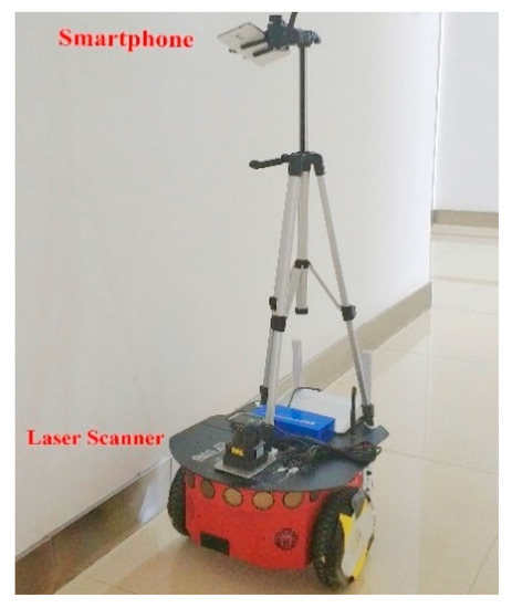 As it is shown in Figure 2 and Figure 3, the NAVIS platform mainly consists of a robot, a smartphone and a 2D laser scanner. Firstly, the robot used in this experiment is the Pioneer 3/DX pioneer robot, produced by the Mobile-Robots company, which offers Pioneer Software Development Kit (SDK) for research. The Pioneer SDK is developed based on the Robot Operating System (ROS) and can control the robot’s motion state by virtue of the serial communication. In ROS, this paper designs a full-coverage path planning algorithm, which enables the robot to explore any large unknown indoor environment autonomously. In addition, a UTM-30LX laser scanner is mounted on the robot platform for scanning indoor environment and then outputs the real-time position and grid map with the help of SLAM algorithm. Finally, a smartphone is installed on the robot platform, which is equipped with its own App software for Bluetooth RSSIs collection indoors. The App is installed on a smartphone and will collect Bluetooth RSSIs data at a frequency of 1 Hz. It is worth mentioning that the App is very simply but efficiently because of Bluetooth Module have been widely integrated into a smartphone.