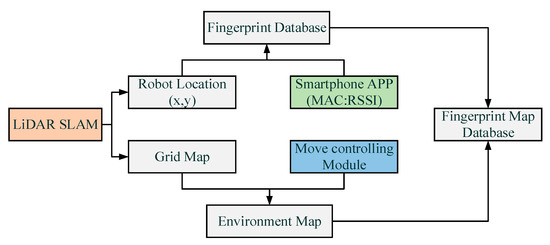 As it is shown in Figure 4, the rapid construction method of the location fingerprint database proposed in this paper includes the following steps: (1) Designing and programming the LiDAR-based SLAM algorithm to obtain the real-time location of the robot and the current scanned grid map; (2) At the same time, the real-time location information and the fingerprint data collected by the smartphone App software will be stored in two matrix respectively and then Kriging Interpolation Algorithm is used to generate a merging matrix of fingerprint data; (3) The robot full-coverage path planning algorithm can control the robot to traverse the indoor environment autonomously, thereby generating a grid map of the entire designated area; (4) Finally, a SOP fingerprint map database can be generated by merging the fingerprint database and grid map information. The SOP fingerprint map database consists of numerous location coordinates of indoor grid map nodes and corresponding SOP measurements.