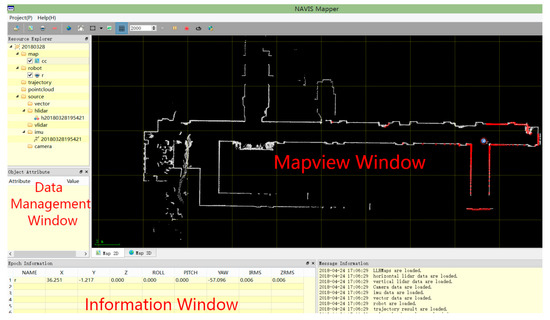 The core of the proposed fast fingerprint database construction method is to obtain the accurate position of the robot as quickly as possible during the process of data collection. As a high-efficiency and high-precision indoor positioning and mapping technology, SLAM technology provides powerful support for the robot’s positioning [23,24]. A real-time two-dimension LiDAR-based SLAM technology is utilized for the automatic robot line collection scheme. The scan-matching algorithm designed for the SLAM is called the Improved Maximum Likelihood Estimated (IMLE) based on a multi-resolution occupied grid map. The IMLE simultaneously calculates the matching results of the point-cloud-frame mode and the frame to frame mode. Excepting that, all the point cloud information contained in the proceeded map is also integrated to get optimized results. Tests showed that IMLE performs well in a given large area indoors, who can get robust and precise matching results. In this paper, a UTM-30LX laser scanner (HOKUYO Company, Osaka, Japan) is placed on the Pioneer 3/DX robot (MobileRobots Company, Burbank, CA, USA). The laser scanner has a field-of-view of 270° with 0.25° angular resolution and the maximum measurement distance is 30 m. The software output module of the LiDAR-based SLAM algorithm is shown in Figure 5. The NAVIS can achieve an average positioning accuracy of approximately RMS 10 cm within certain limits by using our SLAM algorithm.