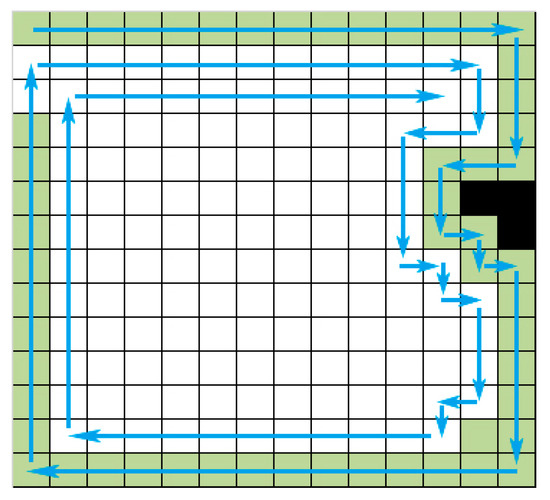 The internal spiral coverage algorithm was proposed by Butler et al. [25]. According to Figure 6, the main idea of this method is that the mobile robot runs clockwise or counterclockwise and then traverse the whole area from initial point of the edge. For example, when the robot runs counterclockwise, if the grid on the right of the current heading direction is empty, turn right 90° and inversely if the grid on the right side of the heading direction is not empty and the forward direction grid is empty, then proceed. In the next, if there are obstacles on the right side and the forward side of current grid, then turn left 90°. According to this cycling strategy, the robot traverses the indoor environment until the right or the front side of robot’s current heading direction is not empty.