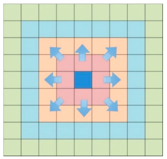 The wildfire algorithm is a simple but efficient searching algorithm shown as Figure 7. The core idea of this method is to start from the starting grid and expand outwards layer by layer. Check whether each layer contains the target pre-defined grid. If not, continue to expand outward until the target grid to be found or the entire area is traversed.