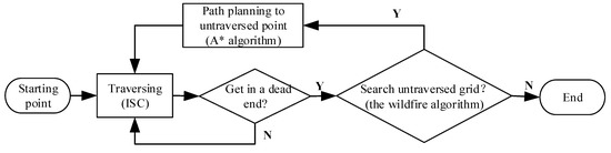 In a word, based on the grid map, the full-coverage algorithm for the robot can be summarized in Figure 8. Firstly, control the robot runs from a point, which is near to the edge of grid map, at a fixed speed. Secondly, the ISC algorithm is driven to traverse the indoor environment if the robot arrives at a dead end surrounded by obstacles, the wildfire algorithm is used to search the nearest untraversed point in grid map. And then, A* algorithm can help the robot to plan an optimal path to the nearest untraversed point. The whole NAVIS system will stop until all the areas are traversed and the SOP fingerprints’ data collection is finished.