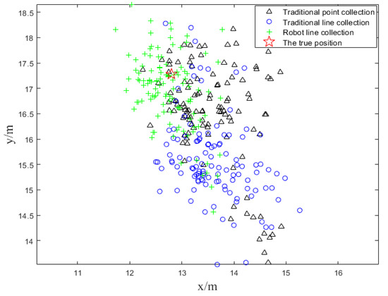 As it is shown in Figure 10, an obvious conclusion can be drawn that the matching positioning points of automatic line collection are closer to the true position among three schemes. The black and blue symbols scattered around the true position and do not distinguish greatly from each other.