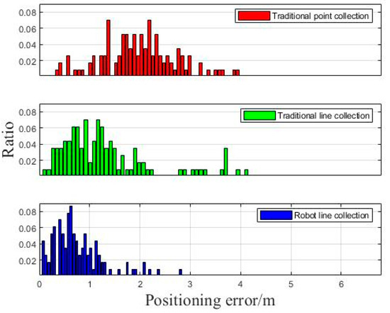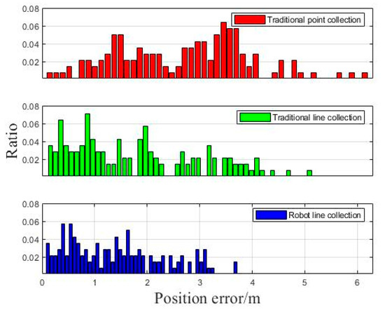 As it is shown in Figure 11, the ratio reflects the percentage of numbers of different positioning points’ error distance. Obviously, the blue histogram centralizes at the part of smaller values, indicating that the robot line collection method can get dense error distribution for most points and greatly restrict the accumulation of the error.