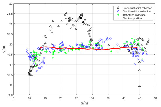 The point map of the positioning results and the real positions are shown in Figure 12. It is quite clear that the positioning results of automatic robot line collection scheme is closest to the real trajectory of the robot, followed by the results of traditional line collection method. Unfortunately, the positioning results of traditional point collection scheme fluctuate fiercely and keep far away from the true trajectory.