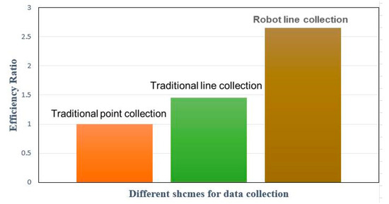 The main reason for the low efficiency of the traditional point collection method and the traditional line collection scheme is that the measurement and stakeout need to be performed before collection and that the operation is discontinuous, which extends the collection work time and reduces the collection efficiency. The automatic robot line collection method can be used for continuous and uninterrupted operation, making full use of the acquisition time and having high collection efficiency. As can be seen from the above figure, the acquisition efficiency of the robot line acquisition method is 2.65 times that of the traditional point collection scheme and is 1.72 times that of the traditional line collection scheme.