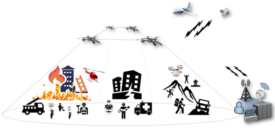 Figure 1. In these use cases, UAS platforms are utilized to manage emergency situations where the network infrastructure, which is fundamental to enable communications and coordinate the operations of emergency response teams, is inexistent or insufficient to achieve these goals. Examples of these use cases are fire extinction activities in dense urban areas, management of extreme situations caused by natural or manmade disasters, or search and rescue operations in remote locations.