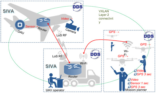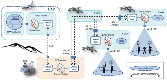 Figure 3, guarantees that: (1) every end-user terminal connected through a Wi-Fi access point (provided by a small-sized UAV) gets attached to the same LAN segment, and therefore belongs to the same broadcast domain; (2) the UAV router, the GCS router and the RPIs themselves have a virtual interface to the LAN, hence they can also behave as DDS publishers and subscribers over the broadcast domain (in particular, each aerial vehicle includes a Data Acquisition Unit (DAU) that publishes data using the DDS middleware); and (3) multicast/broadcast data originated by the tactical UAV is sent towards the GCS, where it is replicated by a VXLAN interface towards the small-sized UAVs that provide a Wi-Fi access point (i.e., multiple copies of the same multicast/broadcast data are not transmitted over the UAV-GCS communication channel).