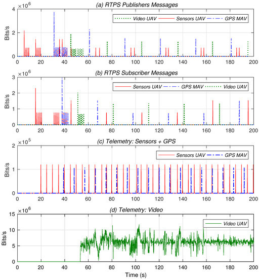 Figure 4d represents the data traffic corresponding to the video camera of the tactical UAV. For simplicity, and similar to the previous case, the figure only shows the data received from one of the RPis. Our practical results confirm that DDS can effectively support the flexible deployment of applications and services, and eases the sharing of information and situational awareness in UAS deployments, through the utilization of application-defined topics and the automated discovery of the published information, which can be requested with specific QoS requirements.