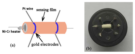 The powders were mixed with deionized water to form a paste. The obtained paste was then coated onto a prefabricated Al2O3 tube to form a thick film and air-dried for 1 h. The length and diameter of the tube were 4 mm and 1.2 mm, respectively. Two Au electrodes were installed at each end of the ceramic tube. Electric contacts were made with two platinum wires attached to the electrodes. A Ni-Cr heating wire was placed through the tube to control the operating temperature. The sensors were annealed at 240 °C for 48 h on the aging equipment in ambient air. The schematic diagram of a typical gas sensor and a photo of the prepared sensor are shown in Figure 1, respectively. The gas sensing tests were carried out on a computer-controlled WS-30A system (Wei Sheng Electronics Co. Ltd., Zhengzhou, China), and the measurement (upgraded and modified according to our experimental needs) was processed by a static process. The sensors were put into a glass chamber (20 L) at the beginning. When the resistances of all the sensors were stable (relative humidity was approximately 27%), the calculated amount of the acetone liquid was injected into the glass chamber by a micro-injector and mixed with air. After the sensor resistances reached a new constant value, the test chamber was opened to recover the sensors in air. The temperature of the sensor was also controlled by a computer. The sensor resistance and response values were acquired by the analysis system automatically. The various environmental relative humidities (RH) for the sensor response measurement in a closed test chamber were achieved at room temperature. Three elements were prepared for each sample, and the average gas sensitivity of the three elements was taken as the gas sensitivity of the sample. The gas-sensing response S in the experiment was defined as Ra/Rg, where Ra and Rg were the electric resistance in air and test gas, respectively.