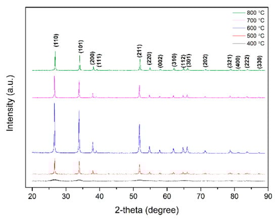 The X-ray diffraction patterns of the powders annealed at 400, 500, 600, 700, and 800 °C for 5 h are shown in Figure 2. As can be seen from the figure, the tin oxide annealed at 400 °C is amorphous. The powders annealed at other temperatures crystallized as one single phase with the tetragonal SnO2 rutile structure with lattice constants of a = 4.738 Å and c = 3.188 Å (JCPDS file No: 21–1250) [36]. The average grain size D was estimated by means of the Scherrer method. The Scherrer equation is as follows: