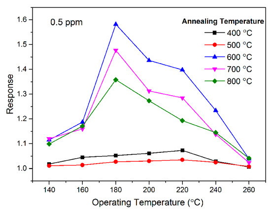 It is well-known that the response of resistive sensors is considerably affected by the operating temperature, and it is obtained by performing the gas sensing experiments at different temperatures. The response characteristic of the SnO2 thick-films as a function of the operating temperature in the range 140–260 °C at 0.5 ppm of acetone vapor in air is shown in Figure 3. It can be seen that SnO2 may potentially be used as a sensing material for the detection of acetone at low concentrations. The responses of all SnO2 samples initially increase and attain the highest value and then decline with the operating temperature. The amount of gas adsorbed reaches an equilibrium at the appropriate temperature. Above this temperature, this equilibrium is interrupted, and the gas response is reduced [38]. This behavior can be explained from the kinetics and mechanics of gas adsorption and desorption on the surface of SnO2 [39]. The quantity of the chemically adsorbed gas species on the surface gradually increases with an increase in the operating temperature until the rate of desorption becomes equal to that of adsorption. The maximum amount of chemisorption is reached at the temperature with the highest gas response. If the temperature is further increased above this temperature, the balance will move to desorption, as the chemisorption is an exothermic reaction. Then the amount of adsorbed gas is reduced, resulting in a decreased gas response [40,41]. The response of SnO2 samples annealed at 400 °C and 500 °C attained a maximum value at 220 °C and the corresponding responses were 1.073 and 1.035, while SnO2 samples annealed at 600 °C, 700 °C, and 800 °C attained the maximum value at 180 °C and the corresponding responses are 1.582, 1.477, and 1.358, respectively. Therefore, 600 °C is the optimum annealing temperature and 180 °C is the optimum operating temperature. The data are summarized in Table 1. The optimum operating temperature of SnO2 shifts to a lower optimal working temperature when annealed at 600 °C, 700 °C, and 800 °C. The reduction of the optimal operating temperature of SnO2 may be caused by the large specific surface area, which increases the concentration of chemisorbed oxygen. Compared to others annealed at a higher temperature, the SnO2 sample annealed at 600 °C exhibits the highest acetone response. This may be ascribed to the smaller particle size of the SnO2 sample annealed at 600 °C. At 180 °C, the responses are 1.582, 1.477, and 1.273 for SnO2 sensors annealed at 600 °C, 700 °C, and 800 °C with 0.5 ppm acetone. Hereafter, we mainly conducted the gas sensing investigations of SnO2 sensors annealed at 600 °C.