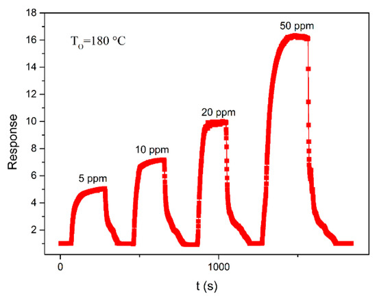 Figure 6 shows the responses of the SnO2 sensor for 5, 10, 20, and 50 ppm acetone at the optimal operating temperature of 180 °C. It can be observed that the sensing response increases when the concentration of acetone increases from 5 to 50 ppm. After injection of 5 ppm, 10 ppm, 20 ppm, and 50 ppm acetone, the response of the sensor increased abruptly, corresponding to the responses of 5.043, 7.221, 10.6, and 16.898, respectively. The response then decreased rapidly and recovered to its initial value within a few minutes after the test gas was released. When injected with 5, 10, 20, and 50 ppm acetone, the response times of the sensor were 70, 38, 41, and 95 s, while the recovery times were 64, 90, 100, and 77 s, respectively. The response time and recovery time of SnO2 reported in the literature are summarized in Table 2. L. Cheng et al. [42] have reported that the response time and recovery time of three-dimensional hierarchical SnO2 nanoflowers for 500 ppm are 9 s and 7 s, respectively. V.V. Krivetsky et al. [43] have reported the response time and recovery time of the SnO2-based sensor for 1800 ppm acetone were 100 s and 500 s, respectively. Compared with the response-recovery time of SnO2 with the same morphology in the literature, the response time and recovery time of SnO2 in the prepared sample were reduced. For acetone vapor sensing, the oxygen species (O−, O2−, O2−) adsorbed on the SnO2 surface play an important role in the electrical transport properties. During the reaction process, acetone molecules donate electrons to the previously adsorbed oxygen species. Thus, the conductance of SnO2 will increase as acetone vapor is introduced into the test chamber due to the exchange of electrons between the oxygen species and SnO2 itself.