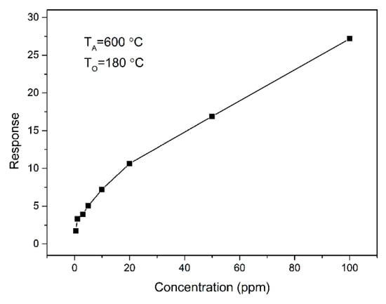 The response of the SnO2 sensor annealed at 600 °C to different concentrations of acetone in relation to the operating temperature is shown in Figure 4. TA is the annealing temperature. We can see that the response increases continuously with an increase in the acetone concentration. This is attributable to the increased surface coverage of the acetone molecules on the membrane at higher concentrations, which promotes a subsequent reaction between acetone and atmospheric oxygen on the membrane surface, leading to a rapid chemical reaction and thus increasing the response. At the optimal operating temperature (TO) of 180 °C, the response of the SnO2 sensor was 3.333, 3.936, 5.043, and 7.274 for 1, 3, 5, and 10 ppm acetone gas, respectively.