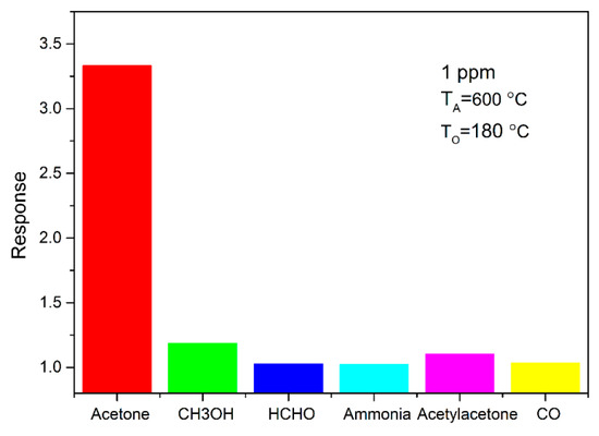 Selectivity is another important factor for gas sensors. The sensor selectivity was tested by exposing it to 1 ppm of different gases at 180 °C, and the test results are shown in Figure 8. It can be seen that the sensor shows a high response to acetone compared to other gases. The results indicate that the SnO2 based sensor shows good selectivity for acetone. Long-term stability is another important parameter for the gas sensor. The stability of the SnO2 sensor is measured at 1 ppm of acetone for 33 days, as shown in Figure 9. The result indicates that SnO2 annealed at 600 °C has good long-term stability, which benefits its practical application.