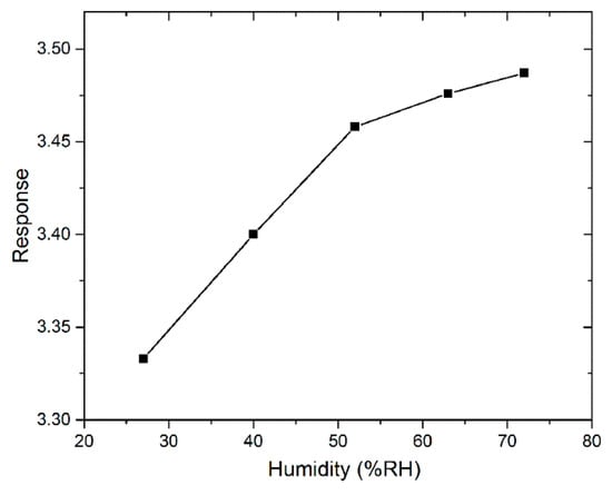 The humidity dependence of the sensing response to 1 ppm acetone at the operating temperature of 180 °C for SnO2 annealed at 600 °C.