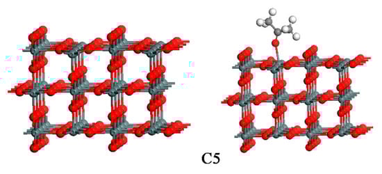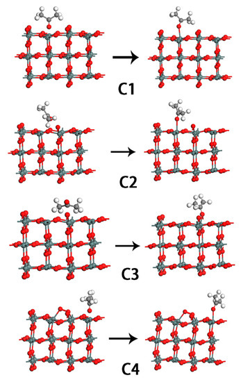 Experimental results suggest that there are adsorbed oxygen species, O2− or O−, on the SnO2 surface. In order to understand the effect of adsorbed oxygen species on SnO2 for acetone gas sensing, we investigated the possible interaction modes between acetone and the SnO2 (110) surface with pre-adsorbed oxygen species O2− and O−. For the O2− adsorbed surface, the acetone can be only adsorbed on the five-fold-coordinated Sn, with the O-down mode as shown in mode C4, see Figure 12. This implies that the surface Sn site on the O2− pre-adsorbed SnO2 (110) surface is the only adaptable site for the acetone molecule to be absorbed. The bond length of Sn-Oacetone is 2.31 Å. The bond length was slightly bigger than that of SnO2 (2.07 Å), which demonstrates that the bond interaction is becoming weaker. The adsorption energy is 1.61 eV. During the interaction process, there are charges of 0.21 e transferring from acetone to the O2− adsorbed SnO2 surface. Simulation results showed that the acetone molecule kept far away from the O− pre-adsorption SnO2 (110) surface after optimization, which demonstrates that the O- pre-adsorption SnO2 (110) surface was inadaptable for the acetone molecule to be absorbed.