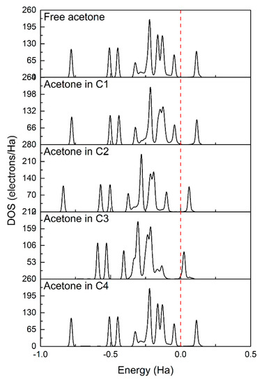 Total density of states (DOSs) of free acetone molecule and the adsorbed acetone in C1, C2, C3, and C4 mode. The vertical dotted line indicates the Fermi energy level.