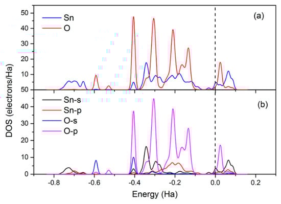 The (a) total density of states (DOSs) and (b) partial density of states (PDOSs) of O (originating from acetone) and Sn. The vertical dotted line indicates the Fermi energy level.