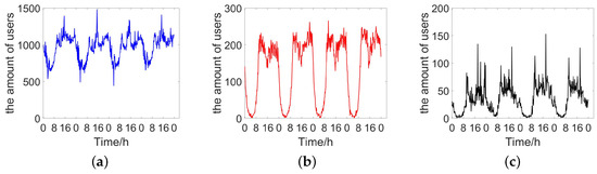 The amount of users extracted from three types datasets in a sample region. (a) The amount of users extracted from the mobility management signals in a sampl region; (b) The amount of users extracted from the call detail records in a sample region; (c) The amount of users extracted from the short message records in a sample region.