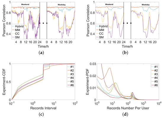 The characteristics of three kinds of data in six cities. The record number of each user is calculated by summing up the number of records belonging to him in the whole data. Here, MM denotes mobility management signals data, SM denotes short message records, CC denotes call detail records, and Hybrid denotes the mixture of three kinds of data. (a) With setting the counting time slot as 10 min, the correlation between the mobile phone users and the population among all the regions in Urlumqi; (b) With setting the counting time slot as 30 min, the correlation between the users and the population among all the regions in Urlumqi; (c) The records interval distribution in 6 cities; (d) The records number of single user distribution in 6 cities.