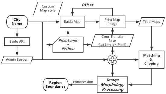 Spatial granularity is crucial for obtaining the meaningful and accuracy population estimation results. Most previous works did not pay enough attention to it and they chose the grids or admin units because they are simple enough. When we scan the whole city, we find that the road network is import for human mobility and regions enclosed by it is a natural segmentation of the city. Thanks to the road network, the size of the region is approximately proportional to its distance to the center of the city and its population, which is a very useful character for us. So we choose the regions enclosed by the road network as our spatial granularity. In addition, now the question is how to complete this. Because of the lack of road network data, we design a system to get it from the Internet with the open access. Baidu Map [23], who opens parts of its substantial map data to developers and researchers, allows us to custom the whole map to leave the road network alone. Based on this custom road network map accessing on the web, we design a typical framework to download the raw data and process it. Our framework is showed in Figure 4. In our system, the input is the city name and the map level, the output is the road network map and some necessary information for further image morphology processing. We first custom the base map to only show the road network which is necessary for the further processing. By accessing another Baidu Map API, we obtain the boundaries of the city to lead the next download step. Then, the core step of our system is to download the whole road network with a certain order and some necessary coordinate information. We may directly download the whole map one time, but some problem stop us to do so because the whole map with enough precision is too big to be printed by the web browser. Although after setting the map to the proper size so that Safari can print the big map, we will face with the data missing problem caused by the big data volume and the poor network accessing and finally obtain the useless map. To work out this problem, we divide the whole map to several parts and identify them by id like the tile map in the web GIS system. In this way, we can download these slices parallel and record their vertex coordinates in the terms of the earth coordinates and projection coordinates. Thanks to this download method, we obtain a valuable table which can be used to transfer the projection coordinates of the road to its earth coordinates. We build this auto-download system with the help of PhantomJS [24] and Python [25]. We have opened this code in our lab web site [26], anyone that has interest can obtain it very easily. Now, we obtain the whole road network map and know how to get the corresponding Global Position System (GPS) coordinates for every pixel of it. We show an example of road network map in Urumqi in Figure 5. Particularly, we define 3 kinds of road network: L1 (expressway), L2 (major avenue), L3 (side road).