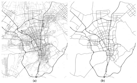 The road network map of Urlumqi. (a) L1 road network map of Urlumqi; (b) L2 road network map of Urlumqi.