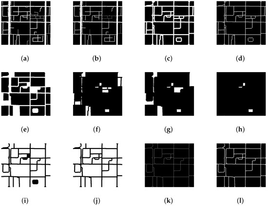 Details of city segmentation by road map. (a) Binary image of road network of a local region; (b) Apply erode operator and open operator to remove alleyways; (c) Apply dilate operator to smooth the residual of alleyways; (d) Apply thin operator to obtain the skeleton of the road network; (e) Calculate region area and remove the small regions; (f) The small regions removed by last step; (g) Apply dilate operator to the small regions to link the near regions; (h) The small regions removed finally; (i) Add the expansive smaller regions back; (j) Apply thin operator to obtain the skeleton of the road network again; (k) Apply dilate operator to smooth the road residual; (l) Add the expansive small regions back.