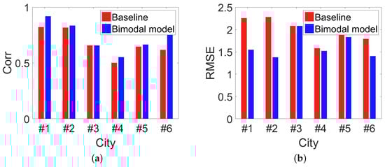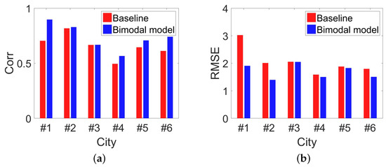 Precision assessments of baseline model and bimodal model. We can see that bimodal model performs better than the baseline model in all the cities. (a) Correlation between estimated population with ground-truth among 6 cities by baseline model and bimodal model; (b) RMSE of estimated population for baseline model and bimodal model in 6 cities.