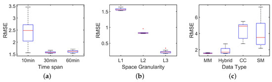 Accuracy evaluation based on RMSE. (a) RMSE with different time slot; (b) RMSE at different space granularity: L1 (the smallest space unit), L2, L3 (administrate units); (c) RMSE with different data: MM (mobility management data), CC (call records), SM (short message logs).