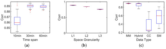 Accuracy evaluation based on correlation. (a) correlation with different time slot; (b) correlation at different space granularity: L1(the smallest space unit), L2, L3 (administrate units); (c) correlation with different data: MM (mobility management data), CC (call records), SM (short message logs).