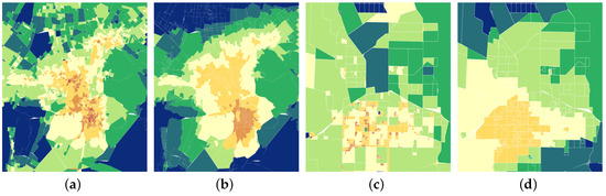 Comparison of estimated population density with baseline density for Urumqi and Shihezi. We use MATLAB [27] R2015b to generate the map-style image. (a) Estimated Population distribution in Urumqi. (b) Baseline population distribution in Urumqi. (c) Estimated Population distribution in Shihezi. (d) Baseline population distribution in Shihezi.