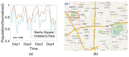 (a) Population flow trend for two particular regions. The time slot is 2 h. (b) The locations of two particular regions. MATLAB 2015b is used to draw the borderline on the Baidu Map web page.