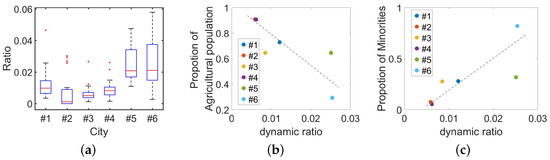 (a) Population flow dynamic index in 6 cities. (b) Relation between population composition (the proportion of agricultural population) and population flow dynamic index. (c) Relation between population composition (the proportion of minorities) and population flow dynamic index.
