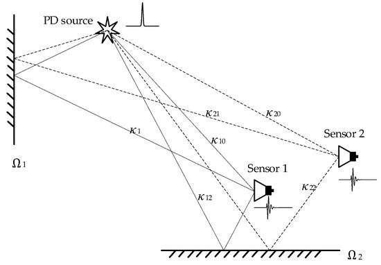 Because of the substation’s complex environment, the propagation paths of UHF signals received by different sensors differ, as shown in Figure 1, where Ω represents the reflection surface, κxx represents different propagation paths, and vi(t) is the superposition of the direct wave and several reflected waves. vi(t) can be expressed as Equation (2), where ei0(t) is the direct wave; θ and φ are the azimuth angle and pitch angle, respectively, between the sensor and any point in the space; and h(θ0, φ0, t) is the transfer function of the sensor at bearing (θ0, φ0). * is the convolution operator, ζk is the attenuation coefficient of the electromagnetic signal, e(t + Δtκ) is the expression of the reflected wave in the time domain, Δtκ is the TD between the direct wave and reflected wave, and h(θκ, φκ, t) is the transfer function of the sensor at bearing (θκ, φκ).