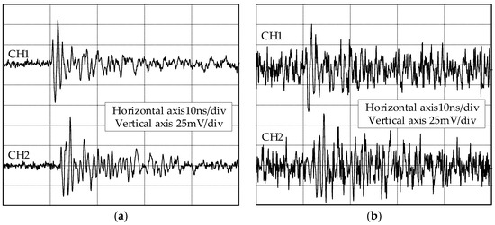 Figure 2 depicts the array UHF signals radiated from a PD defect model in the laboratory. The signals were captured using two Vivaldi antennas [20] and were recorded by a LeCry WR640Zi oscilloscope with a bandwidth of 4 GHz and a sampling rate of 20 GS/s. The distance between the two antennas was 1.5 m, and the distances between the PD defect model and the two antennas were 4.24 and 3.71 m, respectively. The propagation speed of the electromagnetic wave was 3.00 × 108 m/s, and thus the TD of the two UHF signals was 1.767 ns, or 35–36 samples. To verify the effectiveness of the TD estimation method at a low SNR, the field noise was measured at the substation, and the noise was added to the array UHF signals. The noisy UHF signals are presented in Figure 2b, and the SNR was 3.86 dB.