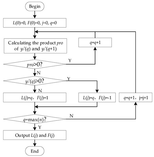 - The noise frame of the UHF signal w′(n) is extracted from the first sampling point to Nmin. The zero-crossing points and crossing direction are obtained using the method shown in Figure 3, where L(j) is the sampling number of the zero-crossing point, F(j) is the crossing direction of the zero-crossing point, F(j) = 1 indicates the rising edge, and F(j) = −1 indicates the falling edge.