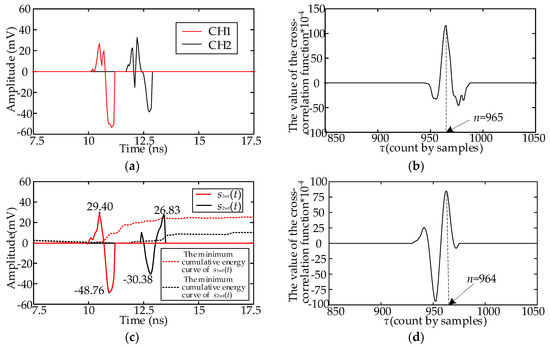 Consider the signals in Figure 2b as an example. The full-wavefront and cross-correlation curve are presented in Figure 6a,b, respectively. The peak of the cross-correlation curve occurs at sample point 965. The numbers of samples for the two UHF signals are both 1000. The estimated number of samples for the TD result is 35, which is the correct value. The full-wavefronts of another two UHF signals with deviation and minimum cumulative energy curve are listed in Figure 6c, and the full-wavefronts are recorded as s1wf(t) and s2wf(t). The cross-correlation curve is illustrated in Figure 6d. According to the aforementioned estimation method, s1wf(t) is the correct full-wavefront. The amplitudes of the crests and troughs of the two full-wavefronts are determined: max(s1wf(t)) = 29.40 mV, min(s1wf(t)) = −48.76 mV, max(s2wf(t)) = 26.83 mV, and min(s1wf(t)) = −30.38 mV. Three extremums are shown on the curve. This indicates that a2 = min(s1wf(t)) · min(s1wf(t)) and bc = max(s1wf(t)) · max(s2wf(t)). Because a2 > bc, the sampling point of the second peak is selected, which is 964. The TD estimation result is 36, which is consistent with the real TD.