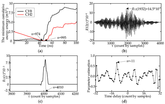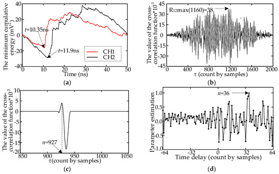 How to determine parameter a is key to the improved cross-correlation algorithm. Per the results of Step 3.1 in Section 2.2.1, the sampling number N′′min is close to the actual onset time of the UHF signal. The difference between N′′min and the sample point of the first extremum was calculated, and the wavefront with a smaller difference was the correct one to be used for determining parameter a.