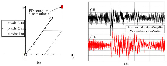 In the substation, the coordinate system was established, and the plane where the array sensors are placed is set as the xoy plane. The location range of the disc insulator was {x|x ∈ (3.3, 3.4)}, {y|y ∈ (8.55, 9)}, and {z|z ∈ (2.6, 3)} in meters. The origin point was selected as the measurement point, o (0, 0, 0). One of the measured array UHF signals is listed in Figure 8d, and the rotation angle of the antenna array is −15°. The TD range of the two UHF signals is 0.5–0.6 ns, and the corresponding samples are theoretically 10–12. The amplitude of the field noise is close to that of the signal, and the SNR is low.