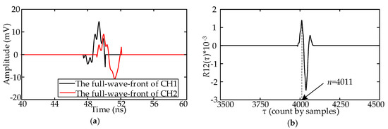 - The minimum cumulative energy curve of yi′′(n) is calculated using Equations (4) and (5), and the sampling number N′′min is extracted, which corresponds to the minimum of the curve. Two signals (duration: 3 ns) are extracted before and after N′′min, and the extracted signal is the effective signal frame, which is recorded as yiwf′′(n).