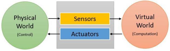 Cyber-physical systems can be implemented in different types of environmental monitoring, such as air quality monitoring, greenhouse monitoring, humidity sensing, soil moisture sensing etc. In these CPS, the physical world can be controlled by sensing and monitoring any specific element through connected sensors, actuators and embedded devices. The sensing elements operate as the inputs that feed information to the cyber component. This information is supplied to computational systems that use it inside optimization algorithms for the purpose of making real or near-time decisions. These decisions in turn command the actuators that serve as output proxies to the physical world, thereby completing the loop illustrated in Figure 1. Because the computation is often done in the cloud, the CPS is connected to the internet (hence the terminology internet of things (IoT)) via WiFi or other wireless or wired communication technologies [,,,,,,,,,].