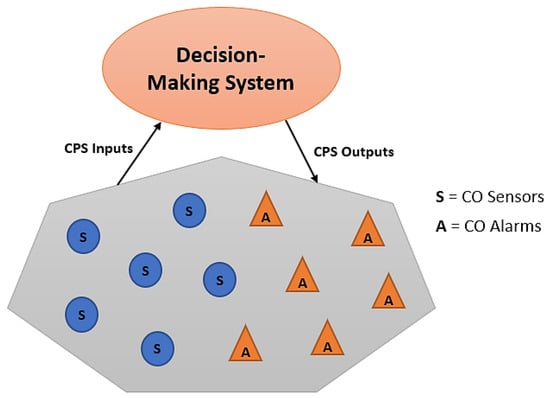 Our idea is to apply the CPS modeling framework to the problem of monitoring carbon monoxide gas in residential and industrial environments. Such a framework provides versatile common platform or ground for comparing existing CO monitoring approaches and for system design and optimization. Thus, CO gas sensors might be deployed in houses or industrial buildings to monitor CO concentration levels. When the CO concentration level crosses a pre-specified specific limit, alarms can be triggered. These events are recorded by the cyber computational component of the CPS, which is responsible with the generation of control commands to mitigate CO problem. The commands control the actuators that impact directly the plants that represent the main cause of CO gas generation. These commands are calculated and generated in real-time for maximum effectiveness. By following a distributed sensor network of Reference [], Figure 2 shows a diagram of a candidate CPS approach that could implemented for CO monitoring and control.