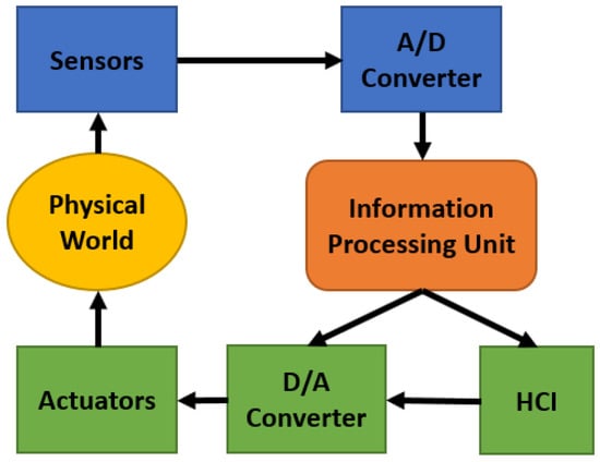 Generally, four types of cyber physical system have been proposed by the researchers. They are: (a) Reactive CPS; (b) Hybrid CPS; (c) Dedicated CPS; and (d) Dynamic CPS. Reactive CPS has a regular interaction with environment and performs at a speed maintained by environment. Hybrid CPS is a mixture of analog and digital parts. Dedicated CPS focuses on a fixed application having a minimum number of resources. Dynamic CPS has very frequent connection with environment, which has high amount of sensor data. For making a CPS system, besides sensors and actuators, A/D converter (analog to digital converter) and D/A converter (digital to analog converter) play big roles. A/D converter can pass the sensor data to the information processing system. Information processing system gives the processed data to the D/A system, which provides control to the actuators and HCI/HRI (human computer interaction or human robot interaction). Figure 3 shows the different components of CPS respectively [,,,]. Networking at multiple scale is also very important for making a useful cyber physical system. Such as in medical sector, if all the sensors along with CO sensors are connected in a single network, it can control all the sensing data at a time and provide immediate execution to all the actuators.