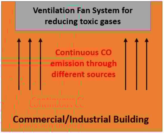 The main benefits of this IoT-enabled CPS-based approach of designing CO monitoring and control systems include: (1) Real-time and automated CO monitoring that directly affect personnel health; (2) energy savings and controlled ventilation; and (3) increase of productivity. In the industrial environment, CO is produced at a very high rate. That is why ventilation system runs all day long for properly ventilating the building to keep people healthy. Figure 4 shows the industrial building configuration. Reliable CO data is needed in order to control this ventilation system. CPS based CO sensing network can give real-time data. This reliable data can run the ventilation system at lower settings that can still maintain the proper ventilation. This controlled ventilation system ends up to huge energy savings. Moreover, in residential and industrial area, it is very difficult to work under very harsh condition having high temperature, high humidity and emission of CO. Thus, it is needed to sense and control all these things. By the sensors, we can only sense; but if all sensors can be implemented within a single CPS system, we can monitor every sensible item and control their sources (such as we can control light source and heating source at a time by monitoring temperature and CO through sensing network. This implementation can increase the productivity of any kind of work. Besides, through this CPS-based approach, one can easily monitor the air quality sensing the CO concentration. This has an immediate impact on the well-being of people living in their homes and working in factories. Continuous well-being has a long-term positive impact on workers. In addition, intelligent control through the CPS approach of the elements that generate CO or that help to control the CO levels (i.e., heaters, stoves, generators, ventilators etc.) can result in energy saving in household environment as well.