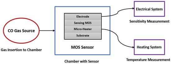 The oxygen adsorption increases if the operating temperature increases (from to and ). works at temperatures less than 150 °C, works at temperatures within 150 to 400 °C and works at temperatures higher than 400 °C. However, temperature needs to be kept at an optimal value, due to its impact on the reliability and lifetime of the sensor. The adsorption also increases with the proper use of doping of the metal-oxide through which sensitivity can be increased. While both n-type and p-type metal oxide semiconductors are used for gas sensing, n-type is more popular. Therefore, the number of n-type MOS-based sensor is generally high. In Figure 5 (which is prepared from the data of Reference []), a brief statistic is given about the metal-oxide semiconductors, which are mainly used for gas sensing application. In general, MOS is used as both thin and thick film to detect CO gas. Thin film is mostly used in MEMS (micro-electro-mechanical systems) based gas sensors. The MOS thin film is combined with a micro-heater in order to create a high operating temperature, which enhances the sensor performance. Electrodes are needed for thin film resistance measurement, through which sensitivity is obtained. Sensitivity, response time and recovery time are three main performance characterization parameters. Response time is the time for responding to a step concentration change from 0 to 90% of the saturated value and recovery time is the time required for the sensor signal to return to 90% of the initial value) [,,,,,,]. A basic block diagram of a MEMS metal oxide semiconductor thin film-based CO gas detection system is shown in Figure 6.