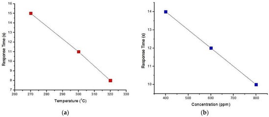 Sharma et al. [] investigated the sensitivity, selectivity and stability of Copper (Cu) doped SnO2 thin films for sensing CO gas in integrated gas sensor array applications. They studied two thin films: (1) Cu doped tin oxide with Platinum on top (SnO2-Cu/Pt) and (2) Cu doped tin oxide with Platinum and SiO2 layers on top respectively (SnO2-Cu/Pt/SiO2). In this process, Cu doping concentration was 0.16 wt.% and thin film thicknesses for doped SnO2, Pt and SiO2 are 3000 Å, 10 Å and 100 Å respectively. The thin film was deposited at room temperature using RF sputtering. The sensitivity of SnO2-Cu/Pt thin film was measured via electrical response time observation, i.e., voltage change per unit time (with and without gas). The voltage change was measured within 5–10 s, when 400, 600, 800 and 1000 ppm concentrations of CO gas were supplied at 250, 270, 300 and 320 °C. It was found that the voltage change was faster and larger for 1000 ppm at 320 °C, which indicated that higher operating temperature and higher gas concentration can help to reduce the response time. This is illustrated in Figure 8. This can be explained by the adsorption of CO gas molecules that increases at high operating temperature, which makes the diffusion faster.