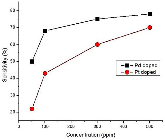 where, Rg and Ra are the resistance of sensing thin film with and without CO gas respectively. It was reported that Pd doped SnO2 thin film was more sensitive than Pt doped SnO2 in dry air. This is illustrated in Figure 9. The duration between recovery time and response time was lower for Pd (around 50 min) than Pt (around 60–65 min).