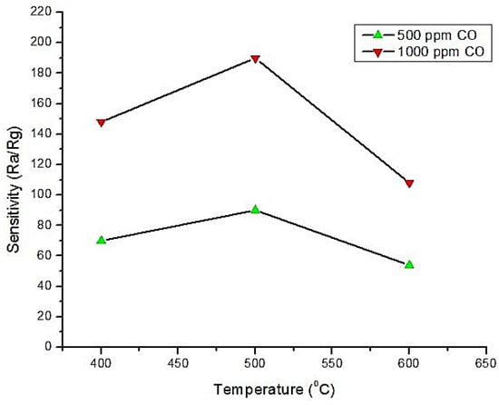 Pd-SnO2 and Pt-SnO2 CO gas sensors were investigated in Kim et al. [] and Wang et al. [] at very low temperature (60–65 °C), i.e., room temperature gas detection. The authors of Reference [] used 1.5 wt.% Pd doping and several mixtures of HPC (Hydroxypropyl Cellulose) for improving the sensitivity. From the measurement of the effect of HPC on sensors, it was found that 15% HPC mixing with 85% Pd-SnO2 showed the maximum response towards 1–30 ppm CO gas concentration. Other ratios had very weak response. It was reported that the relative humidity (%RH) had no effect on this sensor in both dry and wet air at 60 °C. Furthermore, it was found that this technique offered a very good repeatability (almost 5–9.3%) and that the relative response was linear with the concentration. The relative response for 18 ppm CO gas was almost constant over 12 runs and 20 days, which demonstrated a good stability. In the study from Reference [], Pt-SnO2 porous nanosolid was fabricated and calcined in both nitrogen and air. It was reported that the sensor calcined in N2 showed excellent response while the sensor calcined in air had no response towards CO gas (0 to 1000 ppm). The effect of calcining in N2 at different temperatures was studied and it was discovered that calcination at 500 °C offered the highest sensor response towards every gas ppm level illustrated in Figure 10. Another finding was that this sensor response was decreasing, almost linearly, according to the increase in the sensor thickness and in the relative humidity in air. These findings confirmed that the efficacy and selectivity of the fabricated sensor were some of the best.