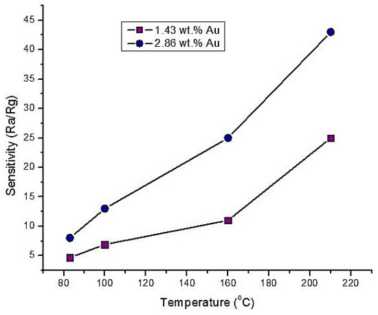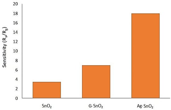 Kim et al. [] explored improvements of photochemically fabricated SnO2 thin film by using graphene (G) and silver (Ag) nanoparticles. After annealing at 500 °C, SnO2 thin films were prepared with 0.0055 wt.% and 0.05 wt.% nanoparticle concentrations of Ag and graphene, respectively. The resistance analysis showed that these sensors worked like n-type semiconductors. The sensitivity at 100 ppm and 400 °C in dry air was significantly improved after incorporating these nanoparticles. This is shown in Figure 14.